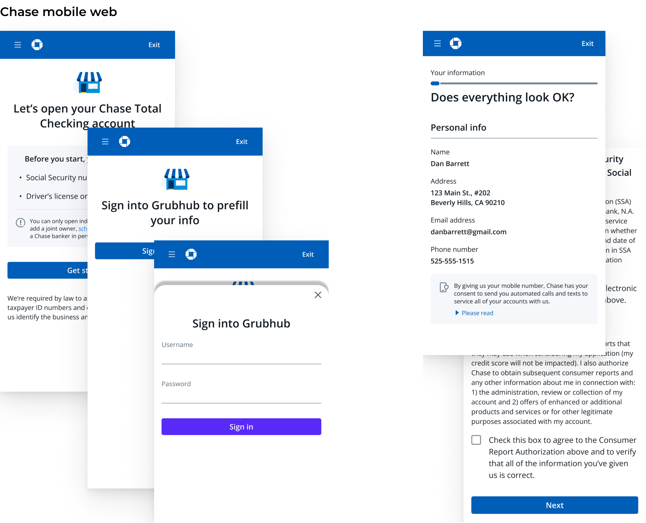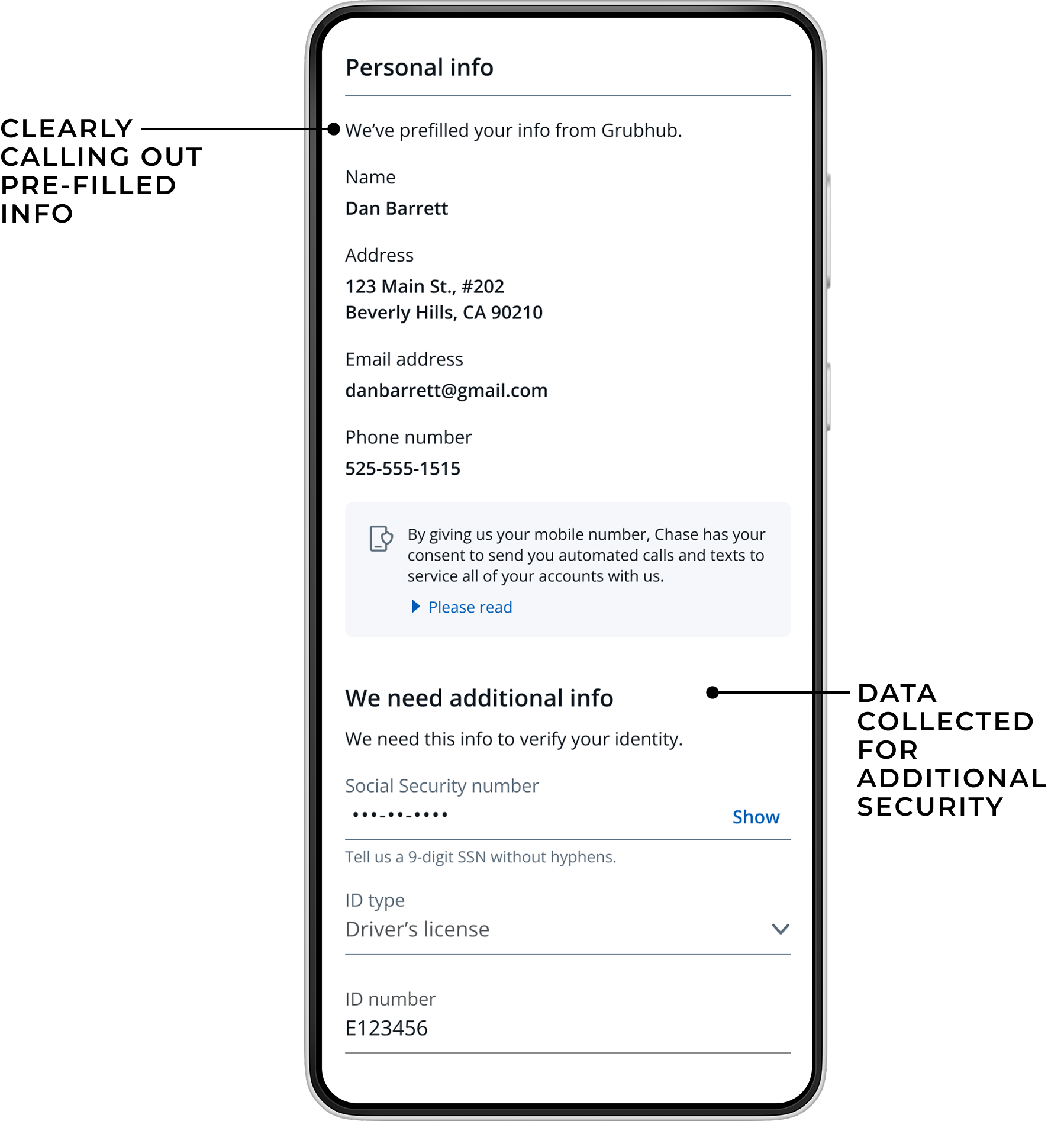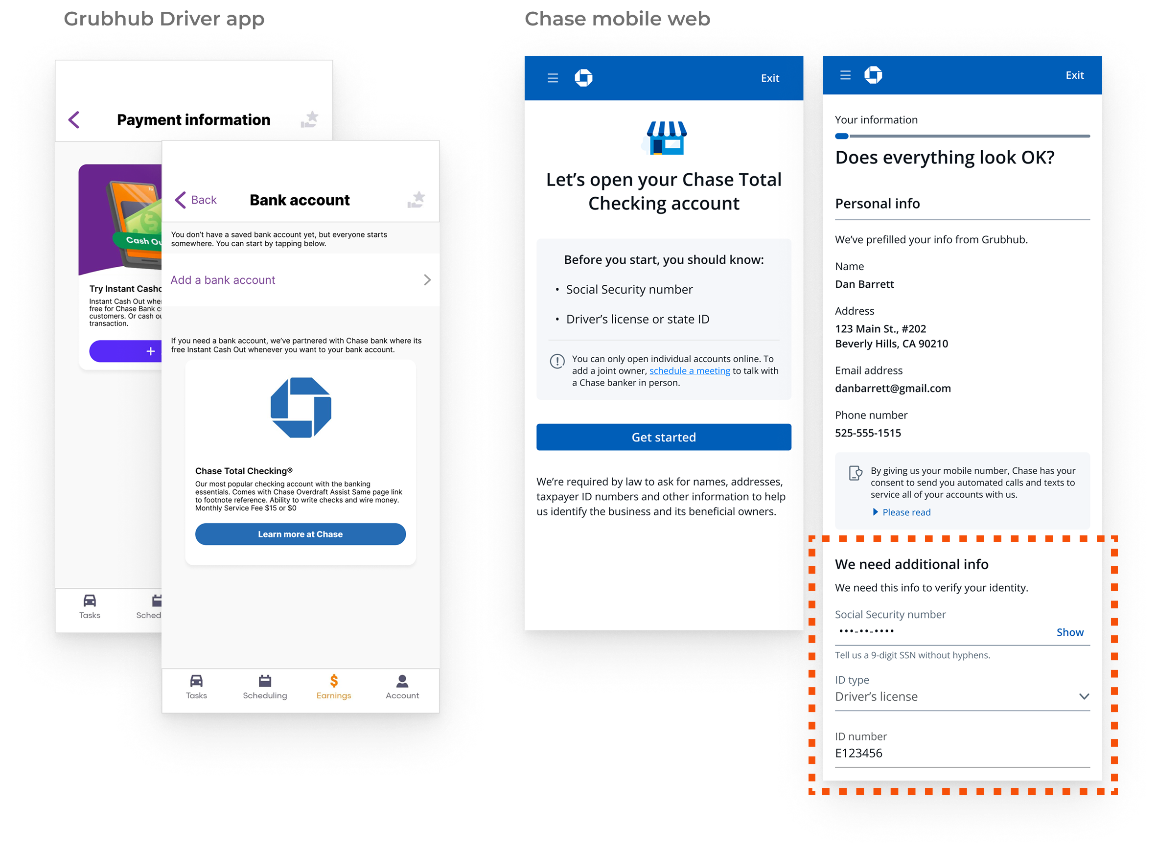For drivers who didnt bank with Chase, I aimed to simplify the onboarding process by utilizing existing data collected by Grubhub.
